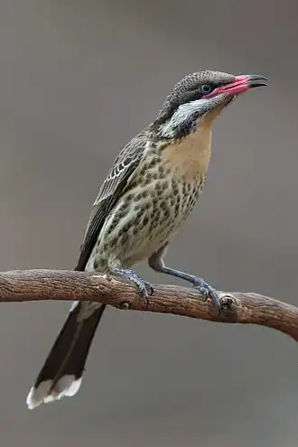 - ↑ a b c d e Peter J. Higgins, Les Christidis und Hugh Ford: Spiny-cheeked Honeyeater (Acanthagenys rufogularis), version 1.0. In Birds of the World (J. del Hoyo, A. Elliott, J. Sargatal, D. A. Christie and E. de Juana Editors). Cornell Lab of Ornithology, Ithaca, NY, USA, 2020