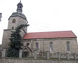 Die evangelische Dorfkirche des Ortsteils Neumark wurde bei einem Luftangriff 1944 zerstört und die Ruine in den 1950er Jahren abgetragen. Die 1925 erbaute katholische Kirche wurde 1950–1951 nach Plänen des Bitterfelder Architekten Johannes Reuter wiederaufgebaut.[13][14]