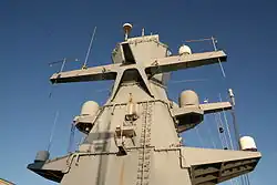 Der Hauptmast, mit dem TRS-3D an der Spitze, ist darunter mit einem Kragen versehen. Dieser enthält sechs SPS-N-5000-Antennen für elektronische Aufklärung (ELINT) im Band von 2 bis 18 GHz. Die Peilgenauigkeit soll bei 2° liegen, die Empfindlichkeit der Antennen bei −80 dBm (10−11 Watt). Es ist denkbar, dass der Frequenzbereich darüber, bis zu 40 GHz, durch die kleinen Antennen unter den Radomen abgedeckt wird.[4] Diese gehören ebenfalls zum SPS-N-5000 und bestehen aus einer horizontal rotierenden, senkrechten Spiralantenne.[39] Diese SIGINT-Antennen für elektronische Aufklärung (ELINT) und Fernmeldeaufklärung (z. B. Ku-Band Radar oder Ka-Band SATCOM) haben eine Peilgenauigkeit von 1° RMS und eine Empfindlichkeit von mindestens −120 dBm (10−15 Watt). Unter dem Kragen sind, an den Salingen des vorderen und hinteren Mastes, Dipole installiert. Fünf Dipole decken das Frequenzband von 200 bis 1000 MHz (UHF-Band) ab. Der Frequenzbereich von 1,5 bis 200 MHz sollte (Stand 2006) durch Käfigantennen, und der von 1 bis 3 GHz durch einen tieferliegenden zweiten Kragen abgedeckt werden. Durch die hohe Empfindlichkeit können die Antennen auch Signale mit Low Probability of Intercept (LPI) Eigenschaften orten.[4] Da der zweite Kragen nicht erkennbar ist, wurde vermutlich die Antennenanlage für 1–3 GHz auf den hinteren Mast ausgelagert, und der Frequenzbereich von 1,5–200 MHz durch auf dem Schiff verteilte Masten mit Stabantennen abgedeckt, um Emitter durch Triangulation anpeilen zu können. Der Antennenwald wird noch unübersichtlicher, weil auch HF-Antennen ergänzt wurden, um Peilfehler, die durch die Masse des eigenen Schiffs verursacht werden, zu kompensieren.[4]