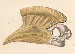Zeichnung eines Braunwangen-Hornvogel-Schädels, Männchen