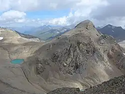 | Curuna Lada (Breite Krone, mittig) und Piz Faschalba (Grenzeckkopf, rechts), davor das falsche Kronenjoch | ||