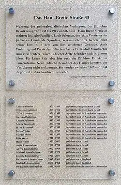 Im Jahr 2014 wurde auf Betreiben der Jugendgeschichtswerkstatt Spandau eine Gedenktafel für die jüdischen Bewohner des Gebäudes angebracht.