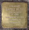 Margot Weiss (geboren am 22. November 1899) war die jüngere Tochter von Louis Salomon und dessen erster Frau Franziska (Fränze) Brasch. Ihr Mann Julius (geboren am 17. Juni 1893 in Krone an der Brahe) war Angestellter in einem der Geschäfte von Louis Salomon in Spandau. Nach ihrer Hochzeit übernahmen Margot und Julius Weiss 1925 von Louis Salomon ein Filialgeschäft in der Pichelsdorfer Straße 97 (damals Pichelsdorfer Straße 16), wo sie auch wohnten. Die Söhne wurden am 21. Juli 1921 (Fritz) und 31. August 1923 (Hans) geboren. Beiden wurde 1936 der Besuch des Kant-Gymnasiums verboten, weil sie Juden waren; vorher waren sie von Mitschülern diskriminiert worden. In der Reichspogromnacht wurden die Schaufenster des Geschäfts zerstört, der Laden wurde geplündert. Nach der „Arisierung“, dem erzwungenen Verkauf ihres Geschäftes, zog die Familie in die Breite Straße 33–34 um, wo sie 1939 in der Mieterliste nachgewiesen sind.[13]