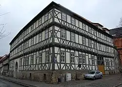 Das Gebäude entstand im Barock als Handelshof um das Jahr 1660 und diente sowohl zu Wohn- als auch zu Speicherzwecken. Die Fachwerkfassade weist unterschiedliche Zierelemente auf. So findet sich die Formen des Halben Manns und Andreaskreuze. Darüber hinaus sind die Stockschwellen mit Schnitzformen verziert.