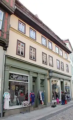 Das Fachwerkhaus entstand in seinem Kern vermutlich im 18. Jahrhundert. Die Fassade ist verputzt und wurde im 19. Jahrhundert umgebaut. Sie ist von einem weitgehenden Verzicht auf schmückende Elemente geprägt. In der Zeit um 1880 wurde ein Ladengeschäft eingefügt. Die Ladenfassade ist mit kannelierten Pfeilern und Kompositkapitellen verziert. Die Haustür des Gebäudes ist im Stil des Klassizismus ausgeführt.