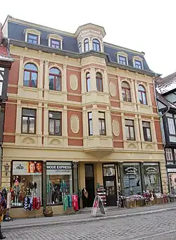 Das in massiver Bauweise errichtete Gebäude entstand im Jahr 1893 als Ersatzneubau für ein Vorgängergebäude. Die Fassade ist im Stil der Neorenaissance gestaltet und zitiert vor allem die italienische und deutsche Renaissance. Ursprünglich befand sich auf dem mittig angeordneten Erker ein Spitzhelm. Der dreigeschossige Bau weicht durch seine Architektur deutlich von der ihn umgebenden Fachwerkbebauung ab.
