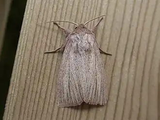 Die Flügelspannweite der Falter beträgt 35 bis 43 Millimeter.[1] Die Vorderflügel sind relativ breit. Ihre Oberseite variiert in rötlich grauen, ockergrauen oder weißgrauen Farben. Zuweilen ist eine schwache schwärzliche Überstäubung vorhanden, jedoch fehlen dunkle Saumpunkte. Makel und Querlinien fehlen ebenfalls. Die Adern sind blass weißlich. Die Hinterflügeloberseite ist zeichnungslos und entspricht farblich den Vorderflügeln.