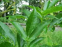 Die gegenständigen, gestielten Laubblätter sind 20 bis 30 Zentimeter lang, unpaarig gefiedert und bestehen aus 5 bis 9 sitzenden Blättchen. Die kurz gestielten bis sitzenden Blättchen sind 6 bis 14 Zentimeter lang und 2 bis 3,5 Zentimeter breit, eiförmig bis elliptisch, seltener verkehrt-eiförmig, spitz bis zuspitzt mit einer spitzen oder abgerundeten Basis. Der Blättchenrand ist gekerbt bis gesägt. Die Oberseite ist tiefgrün und kahl, die Mittelader auf der Unterseite ist mehr oder weniger behaart. Es werden 10 bis 15 Nervenpaare gebildet. Der rinnige und halbstängelumfassende Blattstiel ist 5 bis 6 Zentimeter lang und an der Basis verdickt. Die Rhachis ist rinnig.