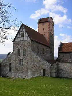 - Die Basilika wurde als Klosterkirche der Benediktinermönche 1112 geweiht. Der Bau aus Sandstein in romanischem Stil war eine kreuzförmige Basilika mit dreischiffigem Langhaus, Querschiff und einem Chorraum, dessen drei Schiffe in Apsiden endeten. Im Dreißigjährigen Krieg wurde die Basilika stark beschädigt. Die Apsiden konnten nicht gerettet werden, die nach 1660 unter Ausschluss der Apsiden neu erbaute Ostwand des Chores verhinderte jedoch die völlige Zerstörung des Bauwerks, deren romanischer Innenraum bis heute erhalten blieb. Der in den 1990er Jahren sanierte Bau dient als Ausstellungs- und Konzertraum sowie als Außenstelle des Standesamtes Breitungen. Der 28 Meter hohe Turm ist das Wahrzeichen der Gemeinde Breitungen.