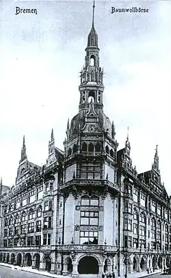 Das Gebäude der Bremer Baumwollbörse wurde zwischen 1900 und 1902 an der südöstlichen Ecke des Marktplatzes, zwischen Schütting und Neuer Börse, errichtet. Architekt war der Bremer Johann Georg Poppe (1837–1915), der den ausgelobten Wettbewerb vor Hermann Schaedtler aus Hannover und Karl Bollmann aus Bremen gewonnen hatte. Alle 54 Wettbewerbsbeiträge waren im Sommer 1898 im Kunstverein Bremen ausgestellt.[2] Die Firma Boswau & Knauer, damals in Berlin und Bremen, zeichnete für den Bau und den Ausbau der Höfe verantwortlich. Mit den repräsentativen Stuckverzierungen fügte sich das Gebäude in das Stadtbild ein. Jedoch erwies sich das Material der Fassade bereits nach zehn Jahren als wenig witterungsbeständig. Die komplette Fassade wurde von 1922 bis 1924 durch Wesersandstein der Obernkirchener Sandsteinbrüche ersetzt. Die aufwändige Renovierung führte der Architekt Blendermann durch.