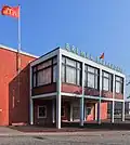 Vor der Halle steht mittig der zweigeschossige Büroanbau der Verwaltung mit einem Eingangsvorbau als Arkade.[2]