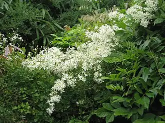 Die Blütezeit reicht von Mai bis August. In den oberen Blattachseln stehen zahlreiche Blüten in großen bis zu 25 Zentimeter breiten, rispigen Blütenständen zusammen. Die wohlriechenden und zwittrigen, gestielten Blüten sind bei einem Durchmesser von 2 bis 3 Zentimetern radiärsymmetrisch mit einfacher Blütenhülle, die Kronblätter fehlen. Am Blütenstiel sind zwei Vorblätter. Die vier weißen, petaloiden Kelchblätter sind schmal und außen am Rand dicht behaart.[1][2] Es sind einige Staubblätter und bis zu 8 freie, oberständige, einkammerige Stempel vorhanden.