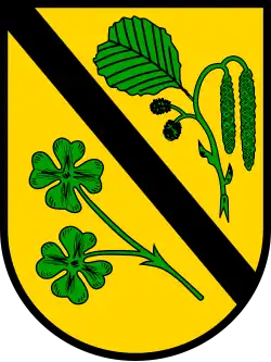 Blasonierung: Das Wappen der Gemeinde Brest zeigt in Gold einen schrägrechten schwarzen Stabbalken, oben begleitet von einem grünen Erlenzweig und unten von zwei vierblättrigen Kleeblättern an einem Stängel.