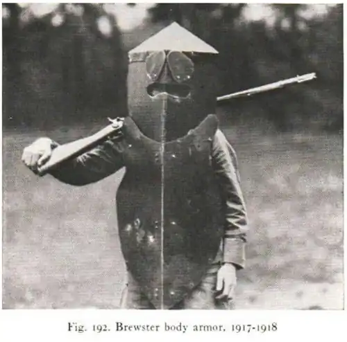 Während des Ersten Weltkrieges suchte das U.S. Militär nach einem besseren Schutz für Soldaten während Kampfhandlungen. Ein Konstrukteur namens Guy Otis Brewster aus Dover, New Jersey entwickelte eine Art Rüstung, die zusammen mit einem Helm sowie einem Rückenschutz am Körper befestigt werden konnte. Die Rüstung bestand aus Chromnickelstahl. Helm und Brustschutz wogen zusammen 18 kg, der Rückenschutz 5 kg. Der Helm war tonnenförmig und mit einem spitz zulaufenden, dachartigem Oberteil ausgestattet. Zur Aussicht diente ein aus dem Stahl ausgeschnittenes Fenster, das mit zwei beweglichen Klappen zum Teil geschlossen werden konnte. Der Helm war so gestaltet, dass er auf den Schultern des Trägers aufsaß und mit Lederriemen am Brustpanzer befestigt werden konnte. Der Brustpanzer bestand aus einer einzigen Platte, die den Oberkörper ausschließlich der Arme bedeckte. Die Ränder der Platte waren zum Teil rundlich und stumpf gearbeitet, um Verletzungen des Trägers vorzubeugen. In der Mitte war ein Grat angebracht, an dem die beiden Seiten zum Körper hin abgebogen waren. Zur Rüstung gehörte außerdem ein Rückenschutz, der aus überlappenden Platten bestand, die auf einem Lederunterteil befestigt waren. Der Rückenschutz wurde mit Lederriemen am Körper des Trägers befestigt. Die Rüstung konnte Schussfolgen aus einem Lewis-Maschinengewehr mit dem Kaliber .30-06 Springfield mit einer Mündungsgeschwindigkeit von 820 bis 900 m/s widerstehen. Trotz dieser Vorteile wurde das Brewster-Körperschild kaum eingesetzt, da der Träger sehr eingeengt und unbeweglich war.[1]