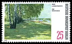 Drei Briefmarken wurden in einem für Berliner Ausgaben ungewöhnlich großem Format gedruckt. Darunter ist ein Gemälde von Max Liebermann, der mit einer zusätzlichen Ausgabe zu seinem 125. Geburtstag geehrt wurde.