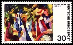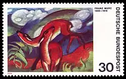 - Bild: Eine bearbeitete Abbildung der genannten Marke. Das Verhältnis der Größe der Briefmarken zueinander ist in diesem Artikel annähernd maßstabsgerecht dargestellt. Sollten keine Marken abgebildet sein, liegt es daran, dass das Urheberrecht des Künstlers noch nicht erloschen ist.