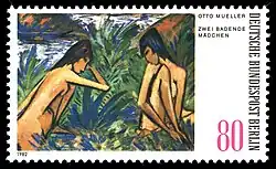 - Bild: Eine bearbeitete Abbildung der genannten Marke. Das Verhältnis der Größe der Briefmarken zueinander ist in diesem Artikel annähernd maßstabsgerecht dargestellt. Sollten keine Marken abgebildet sein, liegt es daran, dass das Urheberrecht des Künstlers noch nicht erloschen ist.