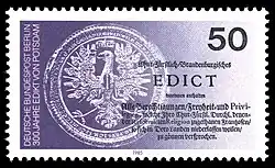 - Bild: Eine bearbeitete Abbildung der genannten Marke. Das Verhältnis der Größe der Briefmarken zueinander ist in diesem Artikel annähernd maßstabsgerecht dargestellt. Sollten keine Marken abgebildet sein, liegt es daran, dass das Urheberrecht des Künstlers noch nicht erloschen ist.