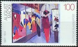 - Bild: Eine bearbeitete Abbildung der genannten Marke. Das Verhältnis der Größe der Briefmarken zueinander ist in diesem Artikel annähernd maßstabsgerecht dargestellt. Sollten keine Marken abgebildet sein, liegt es daran, dass das Urheberrecht des Künstlers noch nicht erloschen ist.