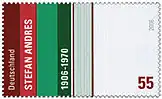 - Bild: Eine bearbeitete Abbildung der genannten Marke. Das Verhältnis der Größe der Briefmarken zueinander ist in diesem Artikel annähernd maßstabsgerecht dargestellt. Sollten keine Marken abgebildet sein, liegt es daran, dass das Urheberrecht des Künstlers noch nicht erloschen ist.
