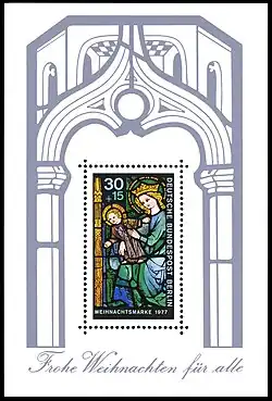 - Bild: Eine bearbeitete Abbildung der genannten Marke. Das Verhältnis der Größe der Briefmarken zueinander ist in diesem Artikel annähernd maßstabsgerecht dargestellt. Sollten keine Marken abgebildet sein, liegt es daran, dass das Urheberrecht des Künstlers noch nicht erloschen ist.