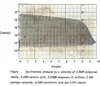 - ↑ a b S. D. Furrow: Chemical Oscillators Based on Iodate Ion and Hydrogen Peroxide. In: R. J. Field, M. Burger (Hrsg.): Oscillations and Traveling Waves in Chemical Systems. J. Wiley & Sons, New York 1985.
