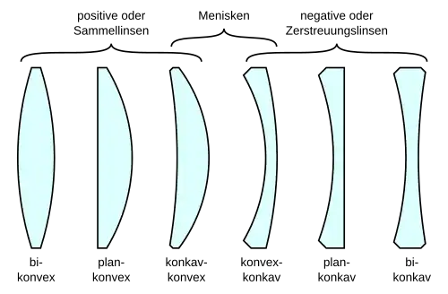 Die Brechkraft, auch Brechwert oder Stärke, eines Brillenglases wird in der Einheit Dioptrie (dpt) angegeben.[48] Da die Korrekturgläser vor dem Auge positioniert sind, verursachen sie in bestimmten Bereichen Abbildungsfehler, an die sich ein Brillenträger jedoch in der Regel gewöhnt. Unterschieden werden Gläser hinsichtlich der optischen Wirkung nach sphärischen, zylindrischen/torischen, multifokalen und Gleitsicht-Gläsern.