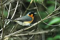 Die Stirn, der vordere Scheitel, die Zügel, die Federn über und unter dem Auge, die Ohrdecken, das Kinn und die Mitte der Kehle sind schwarz und bilden so eine schwarze Gesichtsmaske. Dagegen hebt sich das orange-braune Gefieder des vorderen Halses, der Halsseiten und der Vorderbrust stark ab. Der hintere Scheitel sowie der hintere Nacken und die gesamte Körperoberseite sind bläulich schiefergrau. Die zusammengefalteten Flügel sind ebenfalls schiefergrau, bei geöffneten Flügeln sind die Innenfahnen sichtbar. Das Schwanzgefieder ist schwarz mit weißen Spitzen auf den äußeren Steuerfedern, die bei dem äußersten Steuerfederpaar fast die Hälfte der Feder einnimmt.