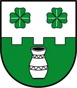 Blasonierung: „Durch Zinnenschnitt geteilt; oben in Silber (Weiß) zwei grüne vierblättrige Kleeblätter, unten in Grün ein silberner (weißer) Krug, ornamentiert mit zwei schwarzen Zickzackfriesen.“[7] |