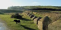 Die Strände wurden mit Stacheldrahtverhauen gesperrt, normalerweise in Form von drei Windungen Ziehharmonika-Draht, die an Metallpfosten befestigt waren, oder einem einfachen Zaun aus geraden Drähten, die an hüfthohen Pfosten befestigt waren.[52] Der Draht grenzte auch ausgedehnte Minenfelder mit Panzerabwehr- und Antipersonenminen auf und hinter den Stränden ab. An vielen der abgelegeneren Strände stellte diese Kombination aus Draht und Minen alles an passiver Verteidigung dar.