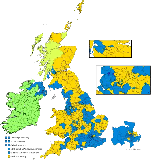 Gewählt wurden 670 Abgeordnete. Insgesamt stellten sich 1338 Kandidaten zur Wahl, davon 43 ohne Gegenkandidaten. 456 Abgeordnete wurden in England, 101 in Irland, 70 in Schottland und 34 in Wales gewählt. Neun Abgeordnete wurden durch Universitätsangehörige gewählt.[7]