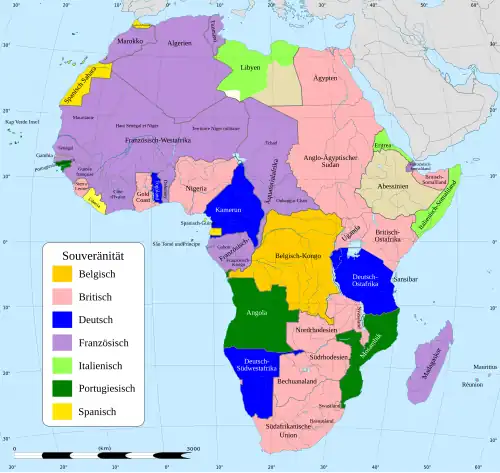1874 zwangen die Briten dem Aschantireich den Vertrag von Fomena auf. Die Aschanti mussten auf alle ihre Rechte an der Küste verzichten und den Sklavenhandel, einst ihre Haupteinnahmequelle, für illegal erklären. Die Gebiete an der Küste wurden in die britische Kolonie Goldküste eingegliedert, der Rest des Aschantireiches bis 1902 ebenfalls unterworfen. Als die Aktivitäten Frankreichs, Belgiens und Portugals im Mündungsbereich des Kongo die Gefahr eines Krieges heraufbeschworen, beschlossen die europäischen Kolonialmächte bei der Kongokonferenz in Berlin (1884/85) Regeln für die Aufteilung Afrikas. Sie definierten die „effektive Okkupation“ als Kriterium für die internationale Anerkennung eines Anspruchs in diesem „Wettlauf um Afrika“ (scramble for Africa).[59]