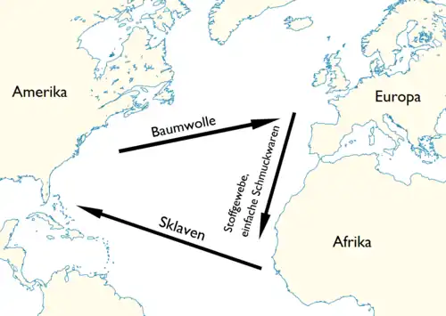 Die 1672 gegründete Royal African Company erhielt von Charles II. das Monopol über die Versorgung der britischen Kolonien mit afrikanischen Sklaven. Von Anfang an bildeten Menschenhandel und Versklavung die Grundlage aller Kolonien in der Karibik. Bis zum Verbot des Sklavenhandels (aber nicht der Sklavenhaltung) im Jahr 1807 waren die Briten für die Verschleppung von 3,5 Millionen afrikanischen Sklaven verantwortlich, was einem Drittel aller über den Atlantik transportierten Menschen entspricht.[19] Um den Menschenhandel zu erleichtern, wurden an der Küste Westafrikas Forts errichtet, beispielsweise James Island oder Bunce Island. Vor allem wegen des ansteigenden europäischen Verbrauchs von Zucker aus Zuckerrohrplantagen stieg zwischen 1650 und 1780 der Anteil der afrikanischen Zwangsarbeiter in den karibischen Kolonien von 25 auf 80 Prozent, in den Dreizehn Kolonien von 10 auf 40 Prozent (wobei Sklaven in den südlichen Kolonien die Bevölkerungsmehrheit stellten).[20] Für Städte im Westen Englands wie Bristol und Liverpool, die eine der drei Seiten im atlantischen Dreieckshandel bildeten, war der Menschenhandel ein bedeutender Wirtschaftsfaktor. Unhygienische Verhältnisse auf den Schiffen, sexueller Missbrauch, Ankettung der Menschen sowie mangelnde Ernährung führten dazu, dass jeder siebte Deportierte auf der Überfahrt starb.[21]