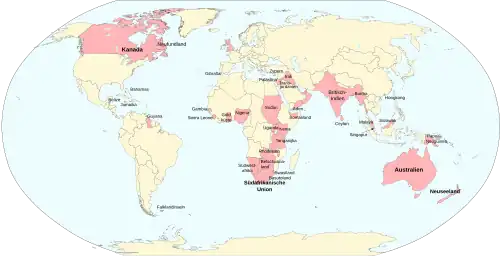 Weitere Gebiete erhielten zu Beginn des 20. Jahrhunderts einen ähnlichen Grad an Selbstbestimmung zugesprochen: Die australischen Kolonien 1901 durch Zusammenschluss zu einem Bundesstaat, Neuseeland und Neufundland sechs Jahre später.[61] Im Rahmen der Reichskonferenz von 1907 wurde der Begriff Dominion für diese Gebiete offiziell eingeführt. 1910 erhielt auch die Südafrikanische Union, die durch den Zusammenschluss von Kapkolonie, Natal, Transvaal und Oranje-Freistaat entstand, diesen Status.