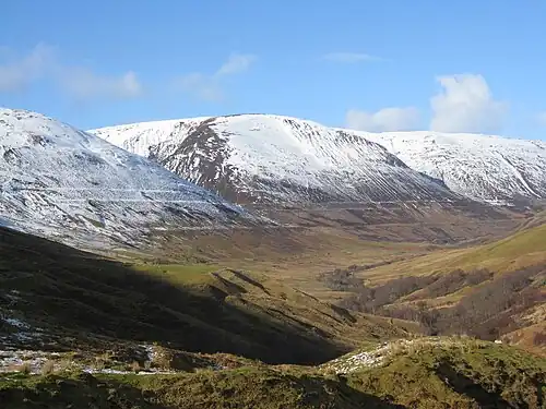 - Um 12.900 Jahre vor heute begann der Loch Lomond Readvance (auch Loch Lomond Stadial),[6] der bis 11.700 Jahre vor heute dauern sollte und mit dem GS-1 korreliert. Dieser letzte Eisvorstoß am British Irish Ice Sheet fällt mit der Jüngeren Dryas zusammen. Die Eiskappe auf dem Schottischen Hochland dehnte sich neu aus und kleine Eiskappen bildeten sich über dem Lake District, über Nordwales und über den Brecon Beacons. Der Eisvorstoß hinterließ Kargletscher, Moränenrücken, Buckelmoränen, Gletscherriefen (Englisch flutings), Schmelzwasserrinnen und Eisstauseen.