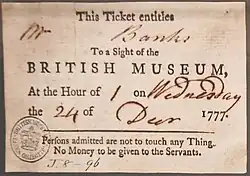 Das Museum entstand, als 1753 der Arzt und Wissenschaftler Sir Hans Sloane seine sehr umfangreiche Literatur- und Kunstsammlung dem Staat übereignete.[2] Das Parlament beschloss, diese Sammlung unter dem Namen British Museum zu erhalten und zu pflegen. Das Museum wurde im Montagu House, einem Herrenhaus im ehemaligen Londoner Stadtteil Bloomsbury, eingerichtet und öffnete seine Pforten am 15. Januar 1759.