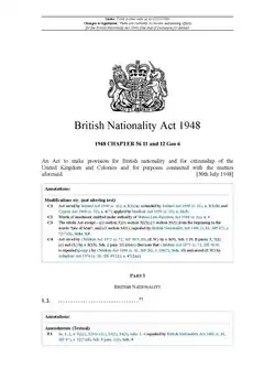 Der British Nationality Act 1948 (11 & 12 Geo. 6 c. 56) stellte eine grundlegende Neuregelung des Rechts der britischen Staatsbürgerschaft dar, zu einer Zeit als man das Empire aufzulösen begann. Man setzte die Vorschläge der Commonwealth Conference 1947 um, die den Dominions[1] empfohlen hatte eigene Staatsangehörigkeiten zu schaffen.[2]