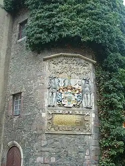 Wettinisches Prunkwappen am Treppenturm im „Collegium Jenense“