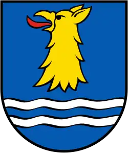 Blasonierung: „„In Blau über zwei erniedrigten silbernen Wellenfäden ein abgerissener, rot gezungter goldener Greifenkopf.““ |