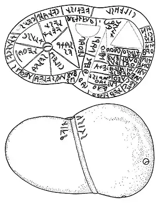 Auf der flachen Oberseite und dem Halbkegel sind Linien und Lettern tief eingeritzt, die Buchstaben fast alle noch lesbar. Die Linien und Erhebungen teilen die Oberfläche in insgesamt 40 Felder, in denen die Namen etruskischer Gottheiten eingraviert sind. Den Rand umläuft ein breiter Streifen mit 16 Feldern. In der linken Hälfte sind sechs Felder annähernd zu in einem Rad mit sechs Speichen angeordnet. Rechts bilden die Felder eine annähernd rechteckige Form.