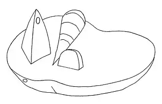 Die Oberseite ist flach, mit Ausnahme von drei Erhebungen. Links oben steht eine dreiseitige Pyramide, 3,9 cm hoch und regelmäßig geformt, mit einem gewölbten gleichseitigen Dreieck als Grundfläche. Die Kanten der Pyramide verlaufen nicht gerade, sondern konvex gekrümmt. An der linken Seite der Pyramide befindet sich etwa 1 cm unter der Spitze ein rundlich-ovales Loch. Die zweite Erhebung entspricht dem Viertel eines Ellipsoids, ist 1,7 cm hoch, 2,0 cm lang und 1,0 cm dick. Die dritte Erhebung ist ein in seiner ganzen Länge fest aufliegender, an der Basis kugelförmig abgerundeter Halbkegel mit einer Länge von 5,6 cm. Die maximale Breite beträgt 2,0 cm, die maximale Höhe 1,5 cm.