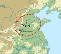 In China folgte auf die frühbronzezeitliche Xia-Dynastie (etwa 2200 v. Chr.–1800 v. Chr.) die Shang-Dynastie (etwa 1570–1066 v. Chr., auch Yin genannt)[23]. Aus dieser Zeit stammen auch die ersten Funde von Schriftzeugnissen in China. Bronze wurde zu dieser Zeit bereits verarbeitet. Hier wurden vor allem Kultgefäße, Figuren, Kopffiguren, Waffen und Rüstungsteile aus Bronze hergestellt, während zur Werkzeugherstellung Holz und Stein, aber keine Bronze genutzt wurde.[24]