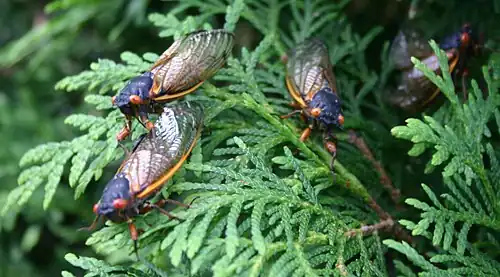 Die 4 cm langen (1,5 in) schwarzen Insekten können weder stechen noch beißen. Sobald sie die Erdoberfläche erreichen, häuten sie sich und hinterlassen die leeren Larvenhäute am Boden. Sie klettern auf Bäume und Büsche, paaren sich und sterben nach ca. zwei Wochen. Es können bis zu einer Million Exemplare pro Hektar (2,5 acres) auftreten.