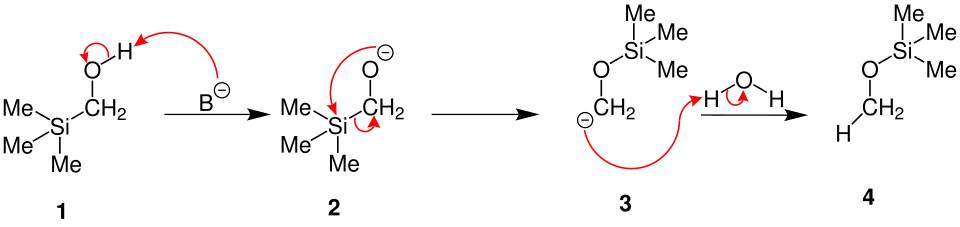 Die Base greift das Wasserstoffatom der Hydroxygruppe des Trimethylsilylmethanols (1) an und deprotoniert diese. Danach greift das freie Elektron des Alkoholats 2 die Trimethylsilylgruppe an, sodass die stabilere Trimethysiliciumoxid-Verbindung 3 entsteht. Durch anschließende Aufarbeitung mit Wasser bildet sich das Methoxytrimethylsilan (4).