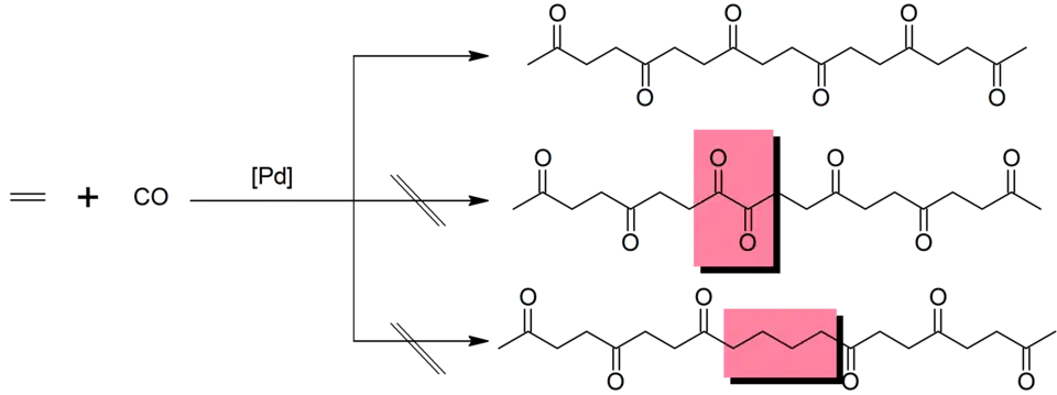 Der Mechanismus beinhaltet eine Insertionsreaktion,[1] in welcher die Polymerkette an das katalytische Zentrum gebunden ist und durch sequentielle Insertion von Kohlenstoffmonoxid und dem Alken zwischen das Palladiumatom und die bestehende Kette wächst. Fehlstellen (in der unteren Abbildung mit rot markiert) treten auf, wenn die Insertion nicht alterniert, also einer Kohlenstoffmonoxidinsertion eine Alkeninsertion oder einer Alkeninsertion eine Kohlenstoffmonoxidinsertion folgt. Der oben genannte Katalysator führt nur zu wenigen Fehlstellen, da die Differenz in der Gibbs-Energie für die Insertion eines Alkens direkt nach einem Alken mit ungefähr 12 kJ/mol deutlich höher als für die Insertion von Kohlenstoffmonoxid liegt.[9]