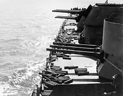 Im Laufe des Krieges kamen bis zu 28 40-mm-Bofors-Geschütze, Kaliberlänge 70, in Zwillings- und Vierlingslafetten an Bord.[4] Die 900 Gramm schweren Granaten der 40-mm-Geschütze hatten eine Gipfelhöhe von 6.797 Metern, die maximale Reichweite bei 45° Rohrüberhöhung betrug 10.180 Meter. Die Kadenz betrug etwa 120 Schuss pro Minute, abhängig vom Tempo der Bedienmannschaft, die Mündungsgeschwindigkeit lag bei 881 Metern pro Sekunde.[19]