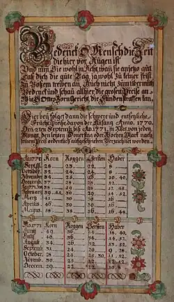 Preisblatt von Korn, Gerste und Hafer (Süddeutschland, 1770/1771) im Museum der Brotkultur, Ulm