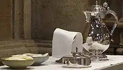 Die Reformatoren verwendeten im 16. Jahrhundert weiterhin Hostien (Oblaten[2]) und Messwein, während sich Theologie und Liturgie änderten. In reformierten Gemeinden wurde es dann wichtig, beim Abendmahl alltagsübliches Brot zu verwenden, weil es sättigt und nährt. In der Church of England wurde die Frage, ob Hostien oder Weißbrot, nach intensiver Diskussion um 1600 zugunsten des Weißbrots entschieden. Die Feier des Abendmahls „unter beiderlei Gestalt“ bedeutete gegenüber der römisch-katholischen Praxis auch, dass eine größere Quantität von Wein benötigt wurde. Die Weinkanne (Foto) ist ein spezifisch protestantisches liturgisches Gerät.