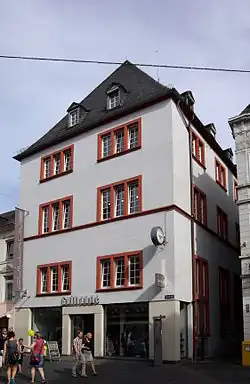 Haus 26 dürfte sogar in das 17. Jahrhundert zurückreichen. Anhaltspunkt für diese Datierung bietet sein rückseitiger, abgewalmter Giebel, der ein noch in der für die Renaissance typischen Tradition stehendes, dreiteiliges und gestaffeltes, reich profiliertes Stockfenster aufweist. Die Straßenfassade ließ der Kaufmann Friedrich Rebmann nach Entwurf des Maurer- und Zimmermeisters Joseph Weis von 1854 neu erbauen. Die Ladenfront wurde um 1900 umgebaut.[8] Eine Gedenktafel am Haus Nr. 26 weist darauf hin, dass hier am 10. April 1822 das Trierer Original Mathias Joseph Fischer (Fischers Maathes) geboren wurde. Im Haus Nr. 27 befindet sich das „Café 1900“.