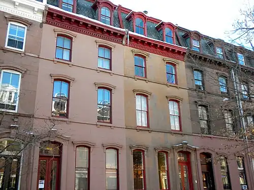 Auch in Manhattan kommen zahlreiche einzelne Gebäude vor, und in den Hudson County Neighborhoods auf dem gegenüberliegenden Ufer des Hudson River in Hoboken bilden sie wieder große Bestände,[4] ebenso rund um Van Vorst Park und Hamilton Park in Jersey City.[5] Die New Yorker Stadthäuser (brownstones) kosten gewöhnlich mehrere Millionen Dollar, wenn sie zum Verkauf stehen. Ein typisches architektonisches Detail in New York City ist die Stoop, eine steile Treppe, die von der Straße bis zum Eingang im Hochparterre führt. Dieser Baustil galt als hygienisch, da die Straßen voll mit Kot waren.[6]